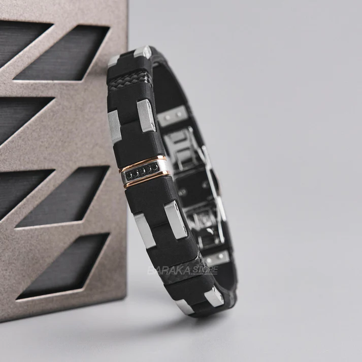 Prachtige heren armband van Baraka met 18karaat rosegoud, zwart diamant 0.10ct, carbon en rubber.