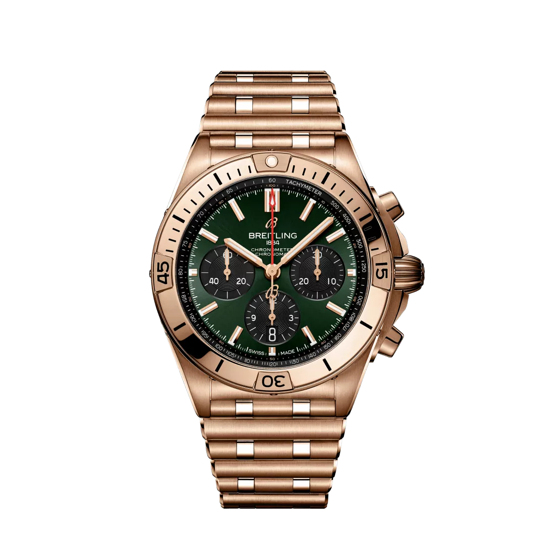 Breitling Chronomat B01 42 RB0134101L1R1 het universele horloge van Breitling voor al uw bezigheden. De Chronomat neemt een belangrijke plaats in in de geschiedenis van Breitling. Geïntroduceerd in 1984, in een tijd waarin extra dunne quartz-uurwerken aan de orde van de dag waren, zette Breitling een gewaagde gok op een indrukwekkend geproportioneerd mechanisch horloge. Gebaseerd op de Frecce Tricolori-chronograaf, die in 1983 was ontwikkeld en gelanceerd in samenwerking met het beroemde Italiaanse luchtsquadron, vierde de Chronomat het honderdjarig bestaan van Breitling in stijl en markeerde de terugkeer van de mechanische chronograaf naar zijn terecht prominente plaats bij het merk dat had gebouwd zijn wereldwijde reputatie op deze ongelooflijke horloges. De Chronomat is verkrijgbaar in verschillende materialen, van roestvrij staal tot luxueus 18-karaats roodgoud, en heeft een kast van 42 mm en de iconische ring met de vier rijderlipjes. De Chronomat is verkrijgbaar met een reeks kleurrijke wijzerplaten en is afgestemd op de kenmerkende “Rouleaux”-armband van metaal of rubber. Hij wordt aangedreven door het interne Breitling Manufacture Caliber 01, een COSC-gecertificeerde chronometer.