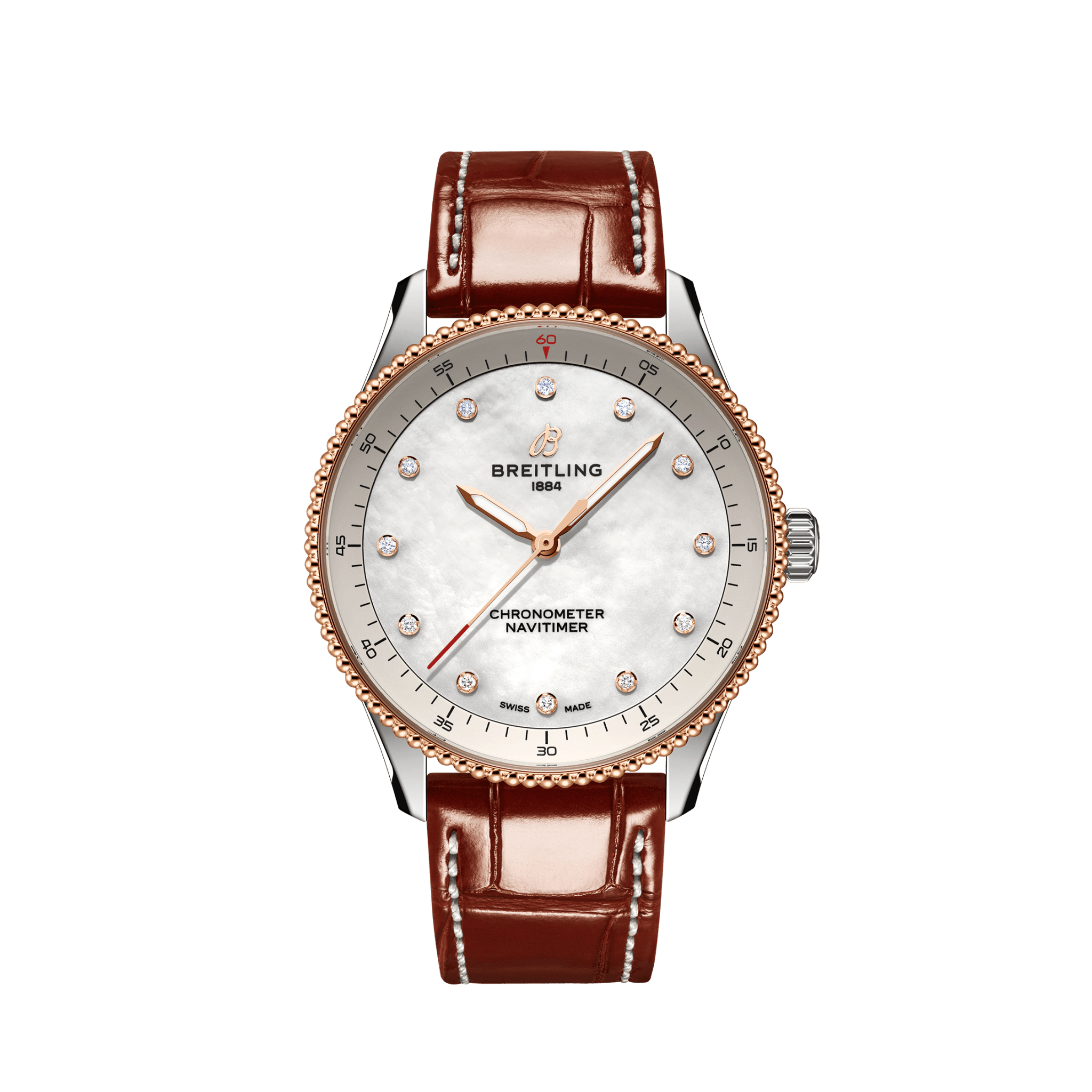 Breitling Navitimer 32 U77320E61A1P1 Breitlings icoon – voor onderweg. De Navitimer is een van de meest herkenbare horloges ooit gemaakt. Het staat op de lijsten van verzamelaars van de beste horloges aller tijden. Wat in 1952 begon als een hulpmiddel voor piloten, is iets diepgaands gaan betekenen voor iedereen die dit uurwerk op zijn of haar persoonlijke reis heeft gehad. Ons icoon is nu verkrijgbaar in de maten 36 en 32 mm voor dames en heren die houden van de look en feel van een horloge met een kleinere diameter. Terwijl de 36 mm Navitimer is voorzien van de kralenrand en de iconische ronde rekenliniaal die de Navitimer zijn onmiskenbare uiterlijk geven, maakt de oogverblindende 32 mm variant gebruik van de rekenliniaal ten gunste van een vereenvoudigd wijzerplaatontwerp dat past bij zijn slanke diameter. Maar deze showstoppers hebben zoveel meer te bieden dan alleen hun nieuwe maten. Een vleugje pastel, parelmoer en traceerbare kostbare materialen worden gecombineerd met subtiele verfijningen om de uurwerken een juweelachtige aantrekkingskracht te geven, waardoor een veelzijdige elegantie wordt toegevoegd aan het legendarische navigatiehorloge dat klaar is voor waar de reis je ook heen brengt.