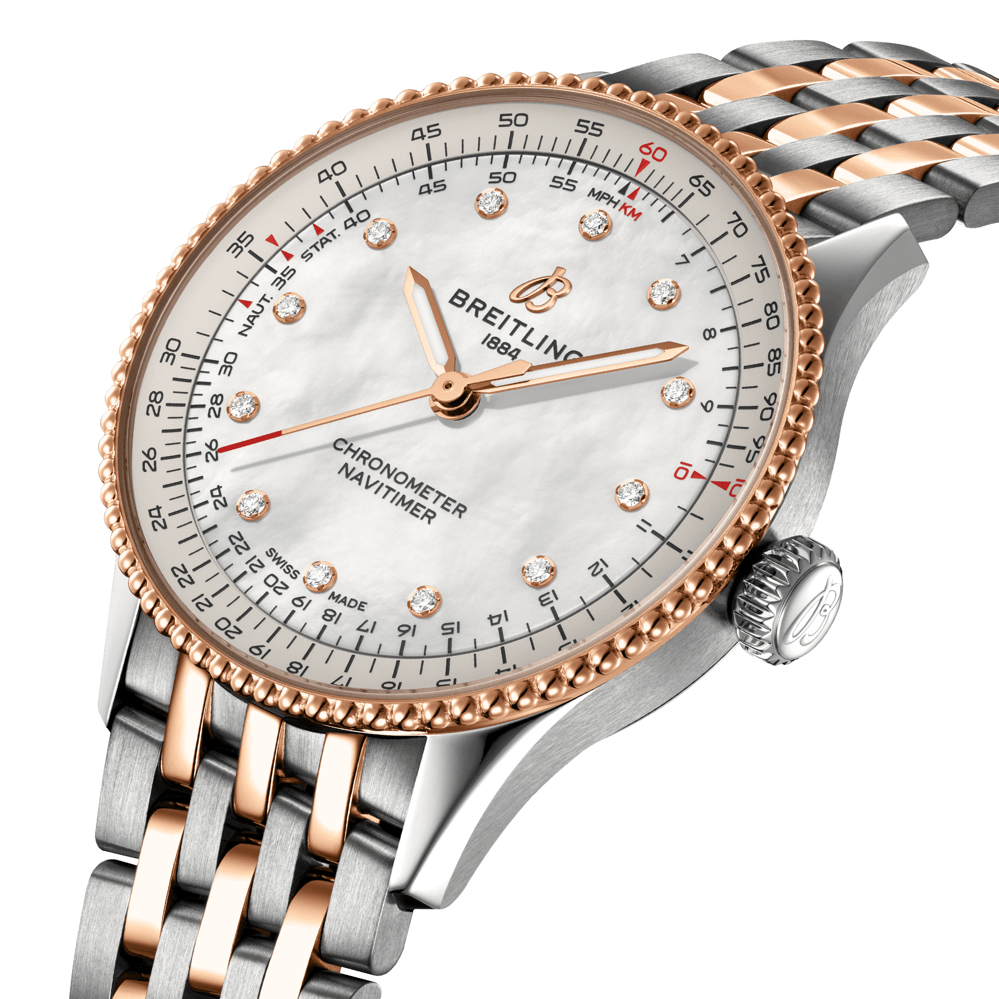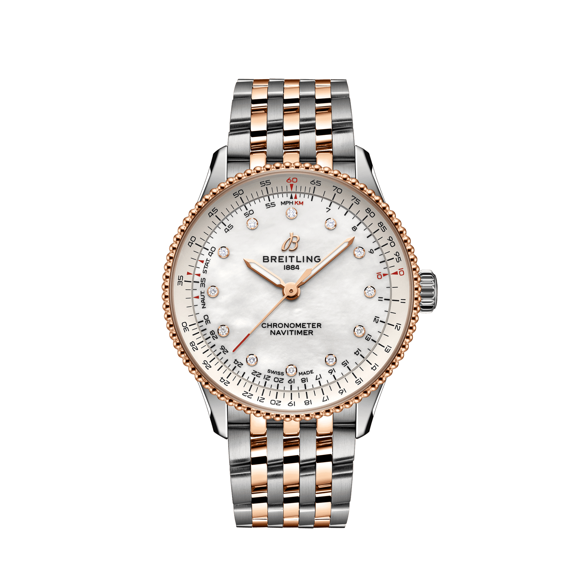 Breitling Navitimer Automatic 36 U17327211A1U1 Breitlings icoon – voor onderweg. De Navitimer is een van de meest herkenbare horloges ooit gemaakt. Het staat op de lijsten van verzamelaars van de beste horloges aller tijden. Wat in 1952 begon als een hulpmiddel voor piloten, is iets diepgaands gaan betekenen voor iedereen die dit uurwerk op zijn of haar persoonlijke reis heeft gehad. Ons icoon is nu verkrijgbaar in de maten 36 en 32 mm voor dames en heren die houden van de look en feel van een horloge met een kleinere diameter. Terwijl de 36 mm Navitimer is voorzien van de kralenrand en de iconische ronde rekenliniaal die de Navitimer zijn onmiskenbare uiterlijk geven, maakt de oogverblindende 32 mm variant gebruik van de rekenliniaal ten gunste van een vereenvoudigd wijzerplaatontwerp dat past bij zijn slanke diameter. Maar deze showstoppers hebben zoveel meer te bieden dan alleen hun nieuwe maten. Een vleugje pastel, parelmoer en traceerbare kostbare materialen worden gecombineerd met subtiele verfijningen om de uurwerken een juweelachtige aantrekkingskracht te geven, waardoor een veelzijdige elegantie wordt toegevoegd aan het legendarische navigatiehorloge dat klaar is voor waar de reis je ook heen brengt.