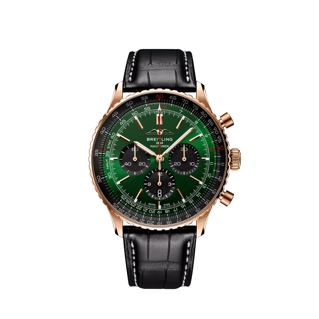 Breitling Navitimer B01 Chronograph 46 RB0137241L1P1 Breitlings iconische pilotenchronograaf – voor onderweg. In 1952 ontwikkelde Willy Breitling een om de pols gedragen chronograaf met een ronde rekenliniaal waarmee piloten alle noodzakelijke vluchtberekeningen konden uitvoeren. Twee jaar later kondigde de Aircraft Owners and Pilots Association (AOPA) het ontwerp aan als officieel uurwerk. De “navigatietimer” – of Navitimer – was geboren. De AOPA was (en is nog steeds) de grootste pilotenclub ter wereld, met bijna alle Amerikaanse piloten in haar gelederen. Als pilotenhorloge tijdens de gloriedagen van de burgerluchtvaart werd de Navitimer gedragen door kapiteins van luchtvaartmaatschappijen en vliegtuigliefhebbers. In 1962 vond het zelfs zijn weg naar de ruimte om de pols van astronaut Scott Carpenter. En niet alleen piloten werden aangetrokken door de onstuitbare esthetiek van het horloge. Beroemdheden uit die tijd zoals Miles Davis en Serge Gainsbourg waren toegewijd, wat bewees dat de Navitimer zowel stijl als functie had. Er zijn veel herhalingen van Breitlings icoon geweest sinds zijn debuut 70 jaar geleden, maar deze nieuwe Navitimer legt de meest klassieke kenmerken vast, terwijl deze worden verbeterd met moderne verfijningen. Een afgeplatte rekenliniaal en een koepelvormig kristal creëren de illusie van een slanker profiel. Afwisselend gepolijste en geborstelde metalen elementen zorgen voor een glanzende, maar toch ingetogen afwerking. Het meest opvallend zijn de nieuwe kleuren in blauw-, groen- en kopertinten die de bijgewerkte kiesopties definiëren. En als er één update is die zeker nostalgie zal opwekken, dan is het wel de terugkeer van de AOPA-vleugels naar hun oorspronkelijke positie om 12.00 uur. Al 70 jaar is het originele pilotenhorloge van Breitling geliefd bij zowel piloten als smaakmakers. Gedragen door astronauten in de ruimte en de grootste sterren op aarde, is dit Breitlings meest iconische uurwerk en een van de meest herkenbare horloges aller tijden.