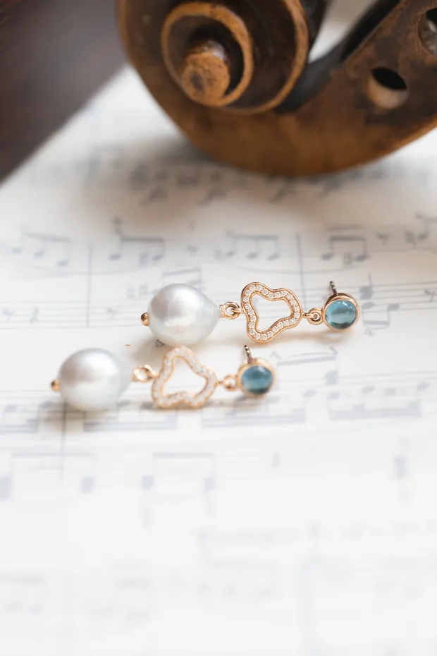 18karaat rosegouden oorsieraden van Bron, Joy collectie met London Blue topaas, wit diamant en Zuidzee barokparel, 48-0.18ct