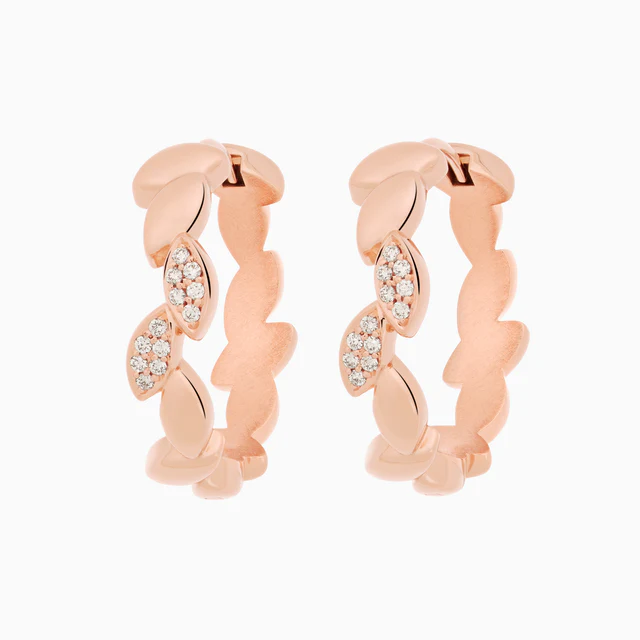 18 karaat rosegouden Poppy creolen van Bron met 0.20ct briljant. Krans van tere blaadjes als oorring; twee blaadjes bezet met witte diamant.
