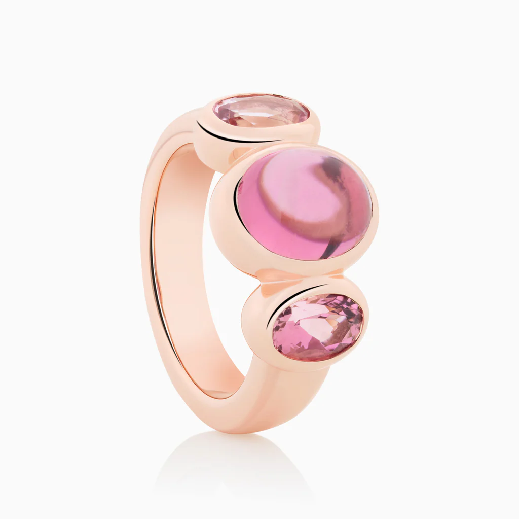Bron Sushi ring met roze toermalijn cabochon en facet geslepen 8RR4902RTCRT de Nieuwste collectie van Bron speciaal voor het 25 jarig bestaan Bronissimo – 25 jaar Fine Dutch Jewelry. De roze toermalijnen in deze ring worden ton-sur-ton uitgezocht en in cabochon en facet slijpsel gecombineerd. Heerlijke edelstenen waar je naar blijft kijken.