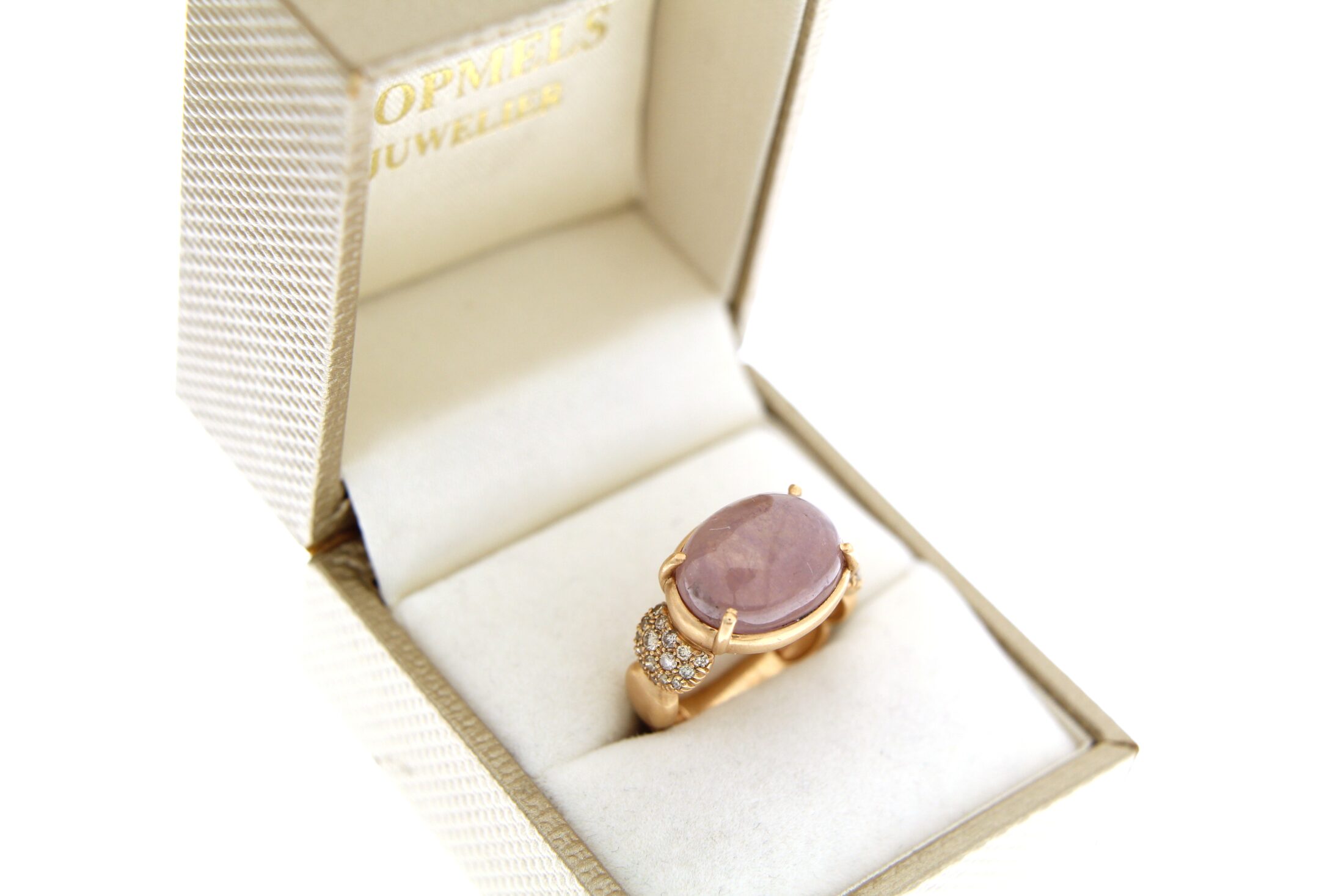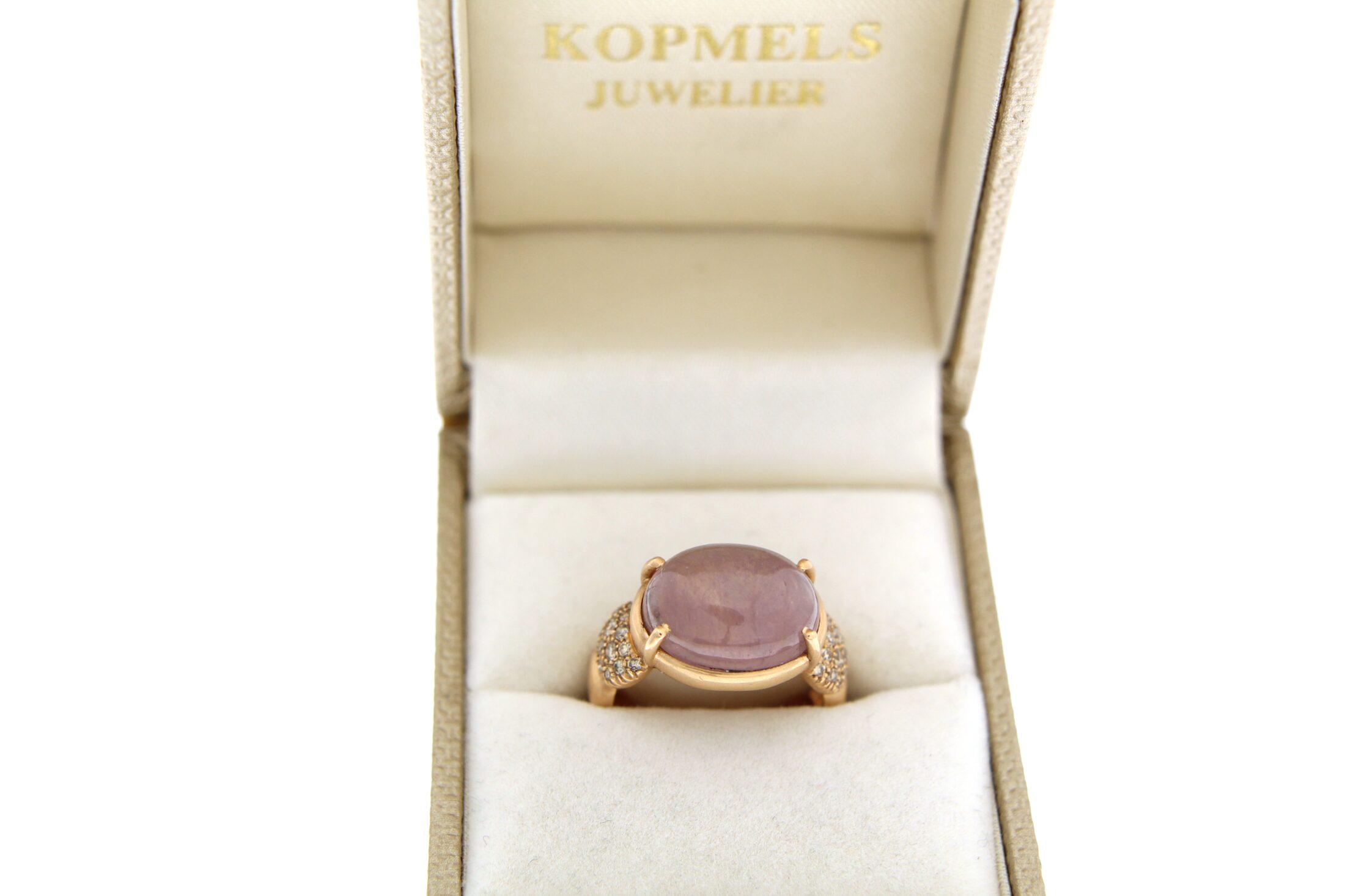 14 karaat rosegouden gematteerde ring met een prachtige rose quartz steen en champagne diamant gezet.