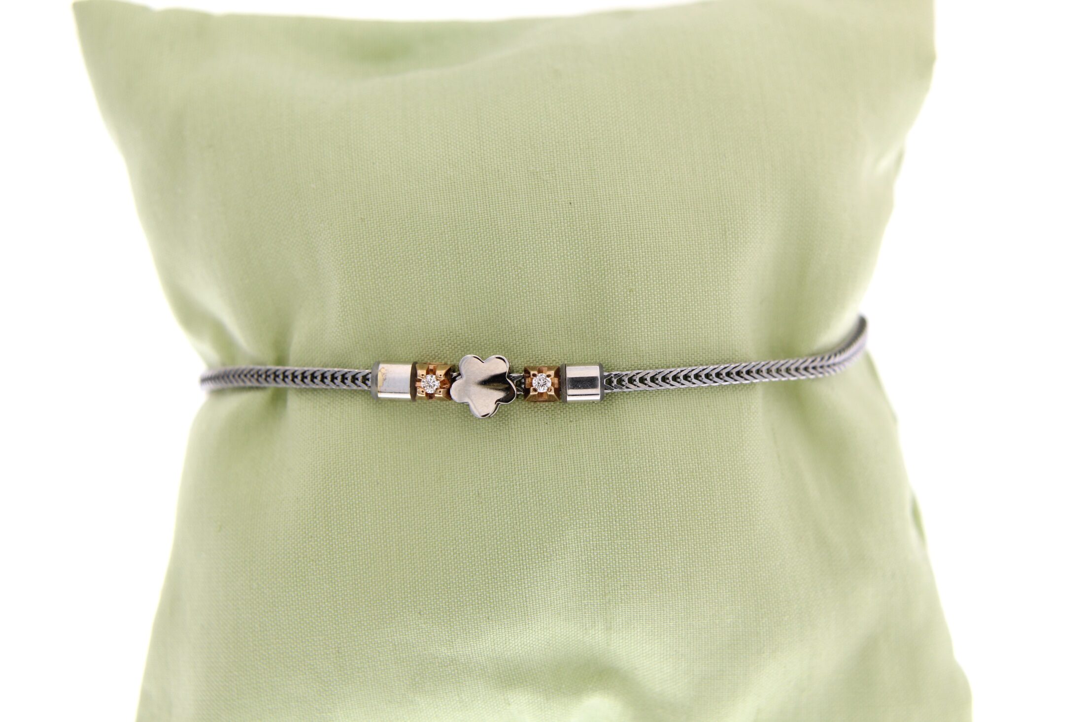 Prachtige zilveren armband met 18karaat witgouden bloem en een diamant in rose gouden zetting