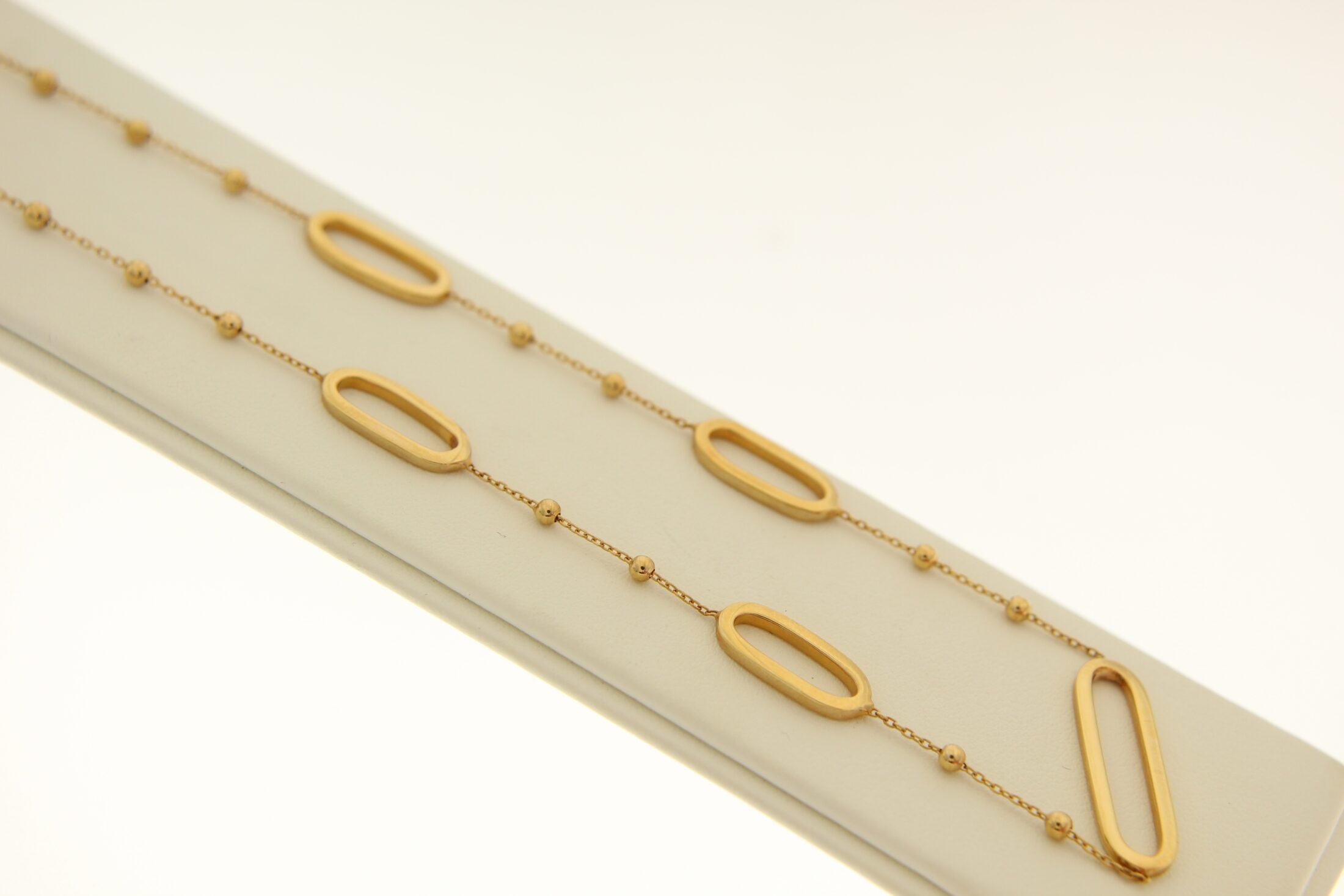 Speels 14karaat geelgouden collier met leuke bolletjes en ovale stukken er tussen
