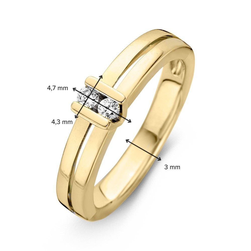 Geelgouden ring in strak design met twee briljanten in een verhoogde v-zetting.