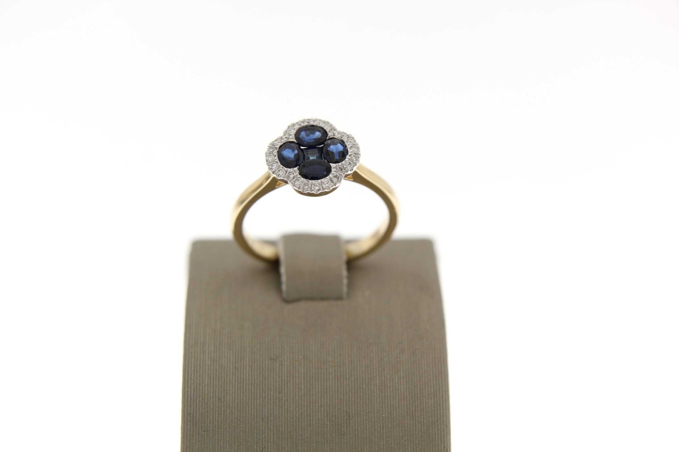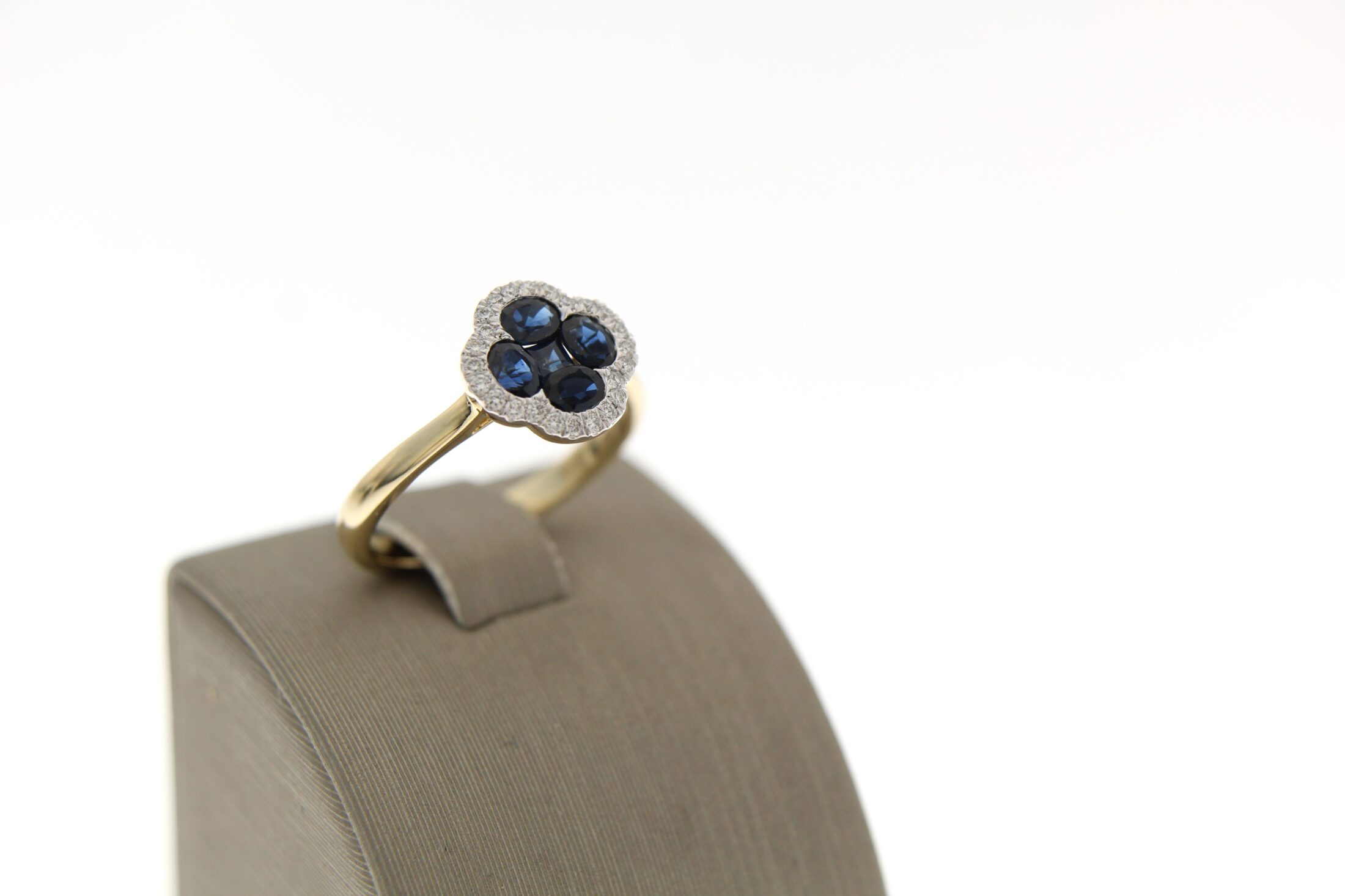 Prachtige 14 karaat geelgouden ring met blauw saffier omzet met briljant 4-0.94ct 24-0.15ct