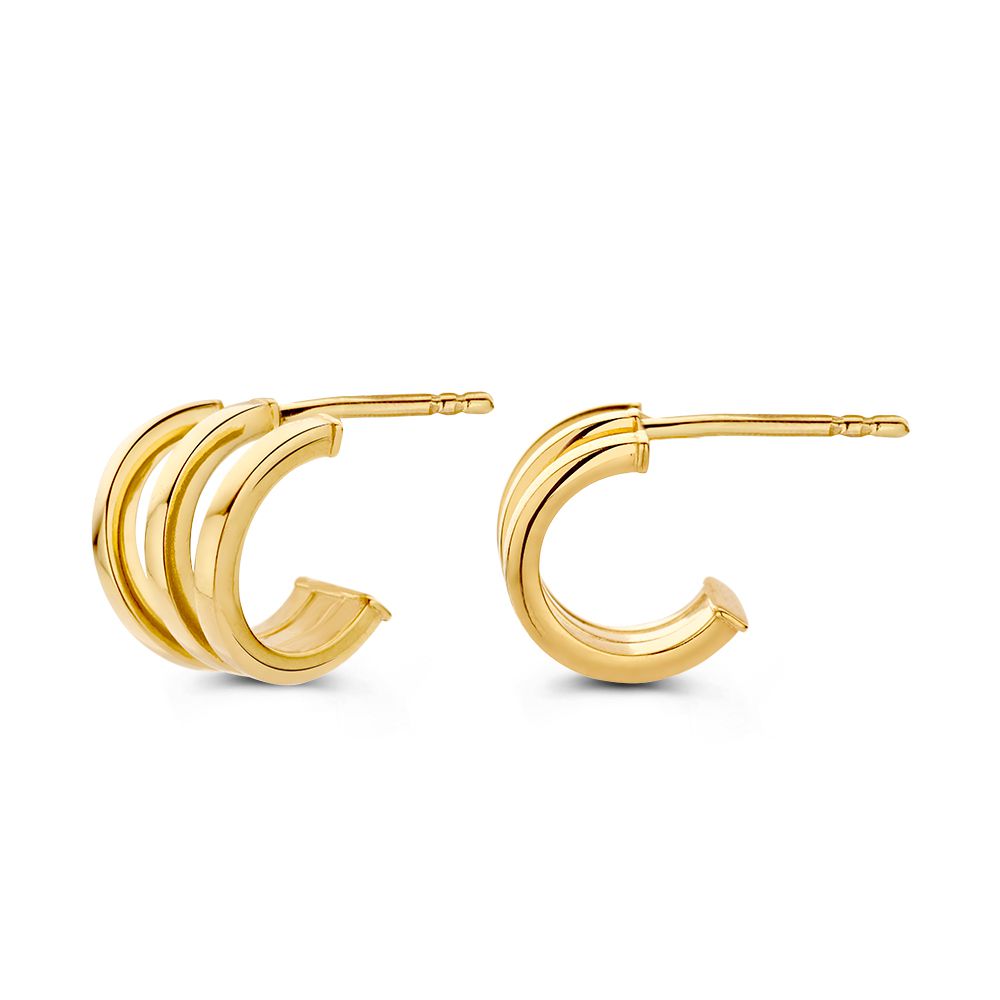 Geelgouden oorstekers met drie banen. Wanneer je de oorbellen draagt, lijkt het alsof ze uit drie verschillende ringen bestaan.