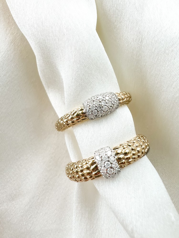 Geelgouden ring met bewerkte band en een witgouden element gezet met diamant in pavézetting.