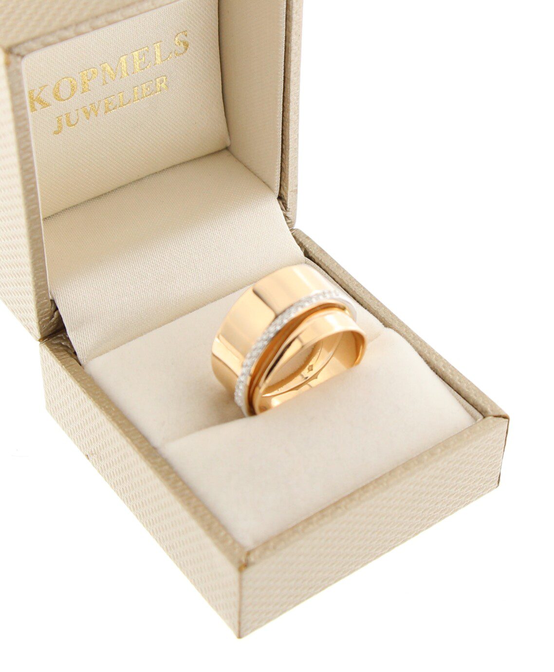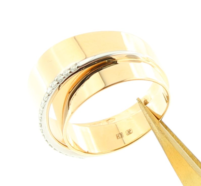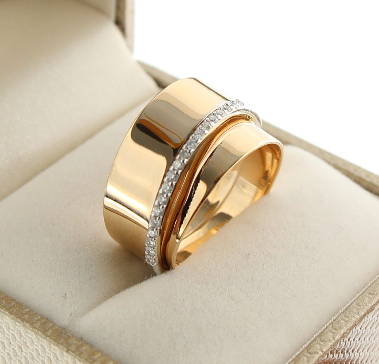 Prachtige brede ring, 18 karaat rosegoud, gezet met 19 briljanten in witgoud, 0.16ct.