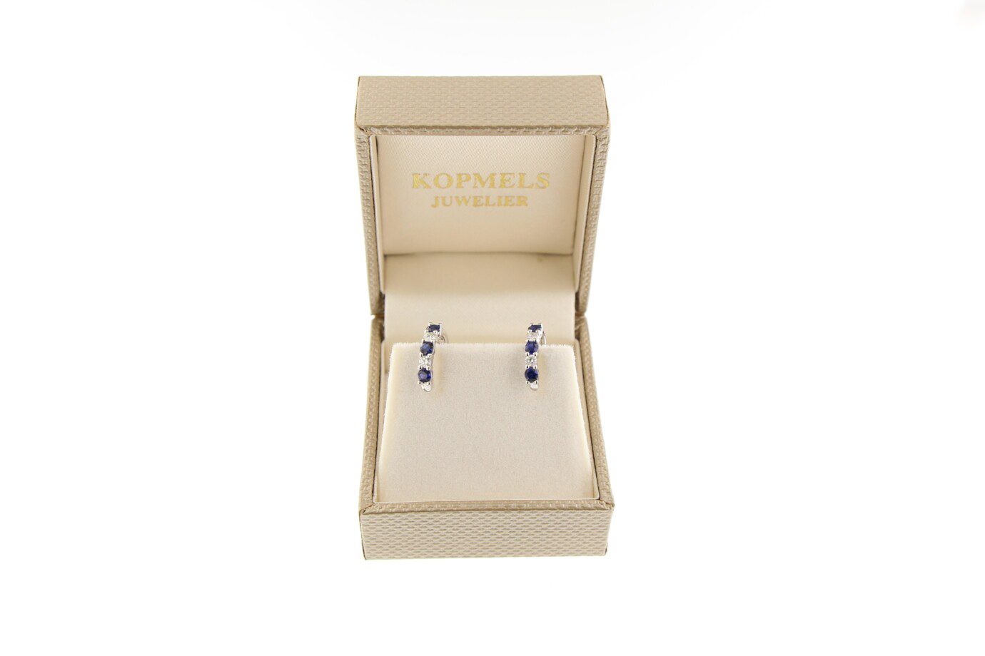 Prachtige 14 karaat witgouden creolen met saffier en diamant. 0.18ct/SI