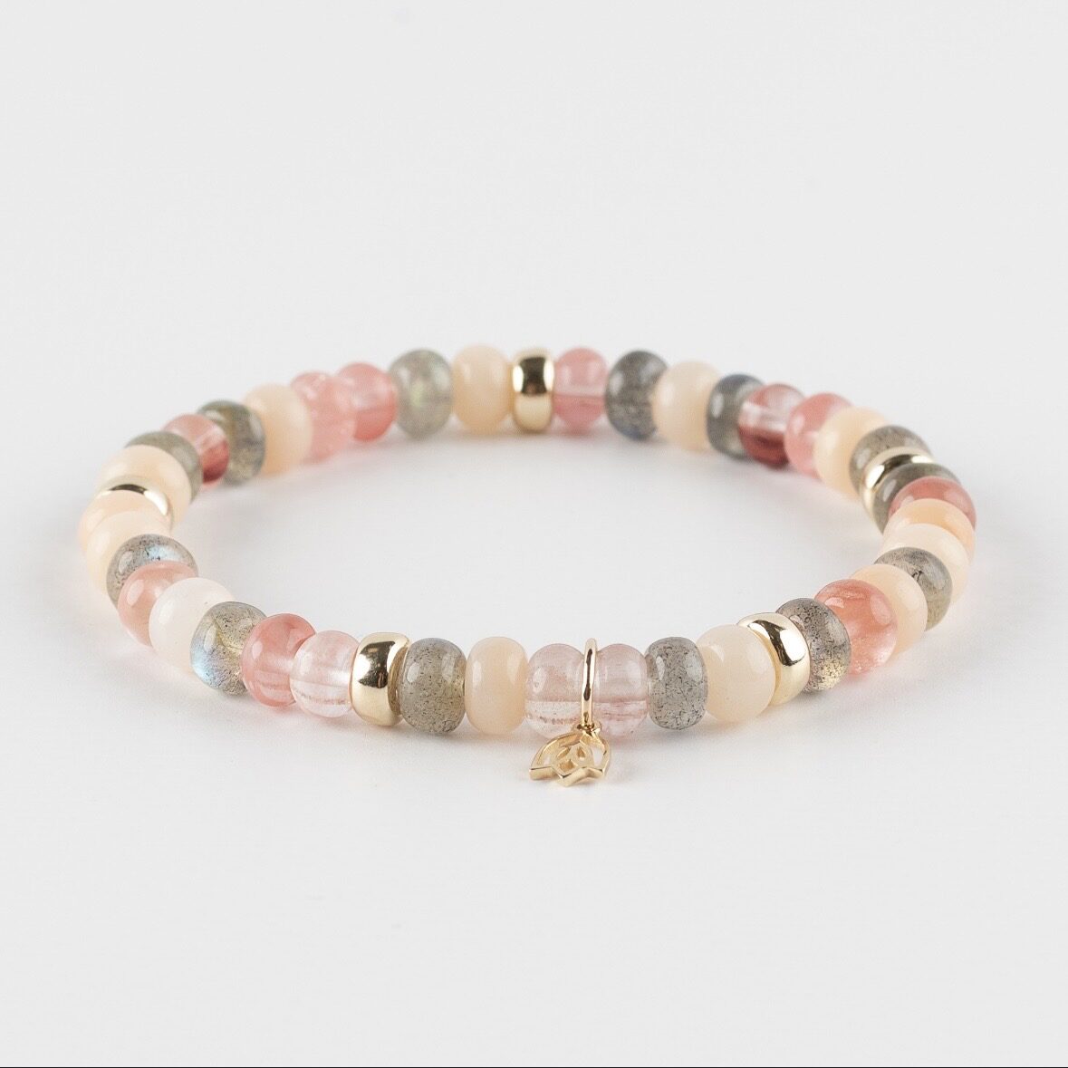 Edelstenen armband (6x4mm kralen) – Vijf gouden beads en tulp logo in 14k goud