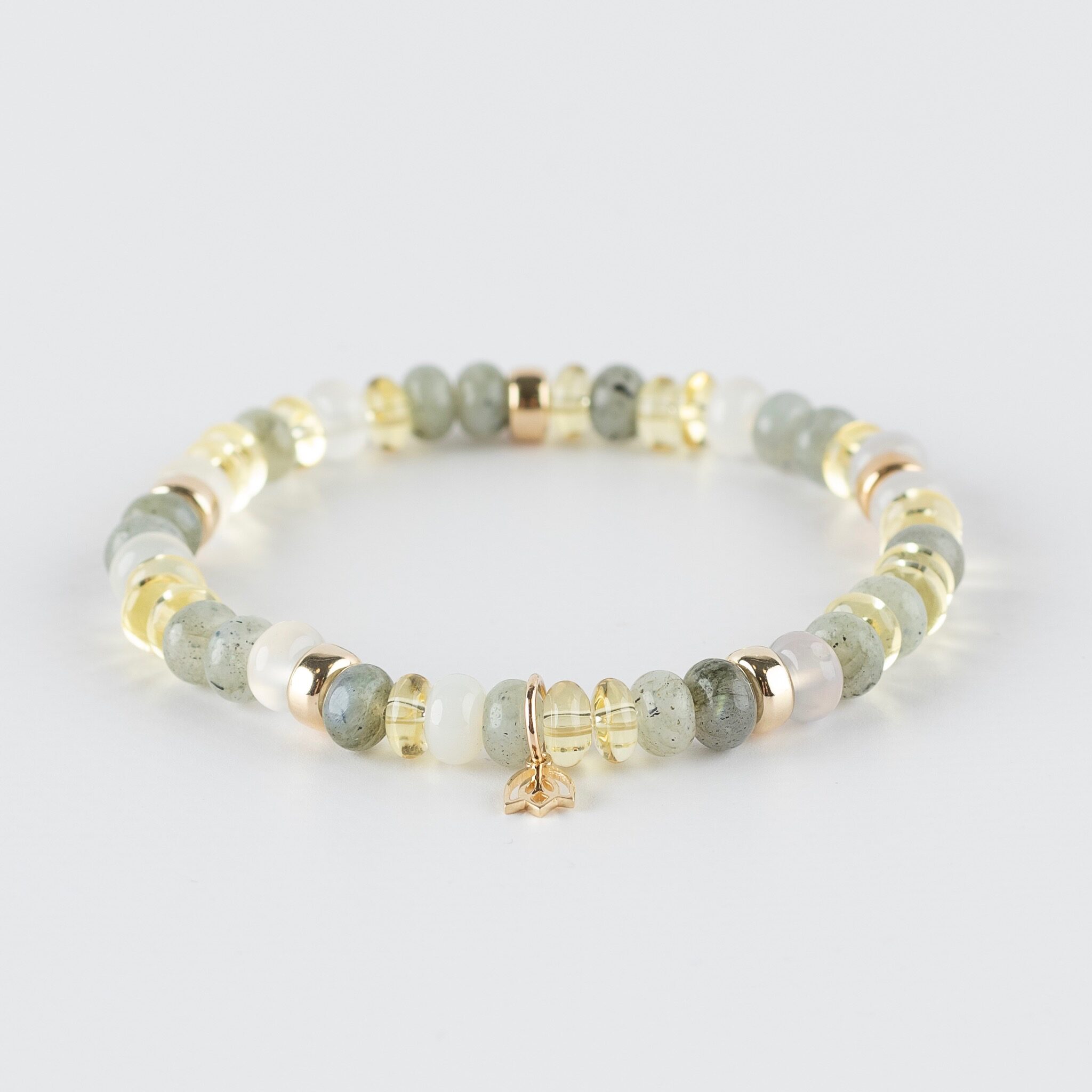Edelstenen armband (6x4mm kralen) | Vijf 14kt gouden beads & tulp logo